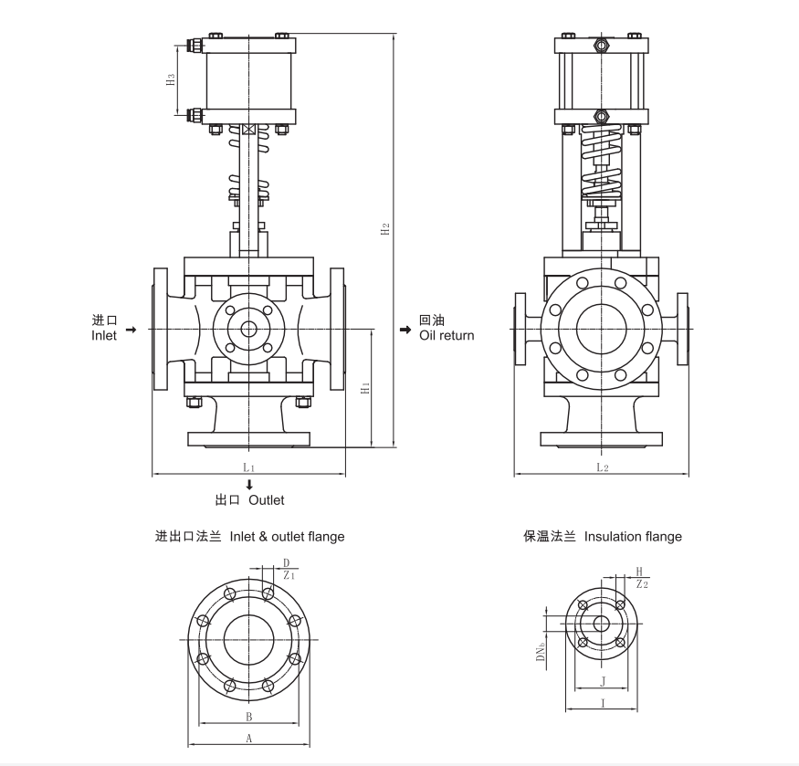 BJ643H系列气动保温三通阀连接结构采用法兰连接,阀体材料为铸钢。阀芯为铝合金材料,在使用过程中阀芯会根据阀体不锈钢密封面做自动调整修复,从而延长使用寿命。气缸和活塞都是按照阀门参数设.计定做,保证阀门能最佳的开启和关闭,进一步延长使用寿命。立柱及阀杆材质为不锈钢,保证阀门在恶劣的环境下不被锈蚀,可正常使用。活塞杆上安装的.弹簧不仅保证了阀门在0.3MPa到1.0MPa压力之间的使用,也起到了缓冲作用,保护了阀芯和活塞,同时在气缸失气的情况下,可以封住出油回路。